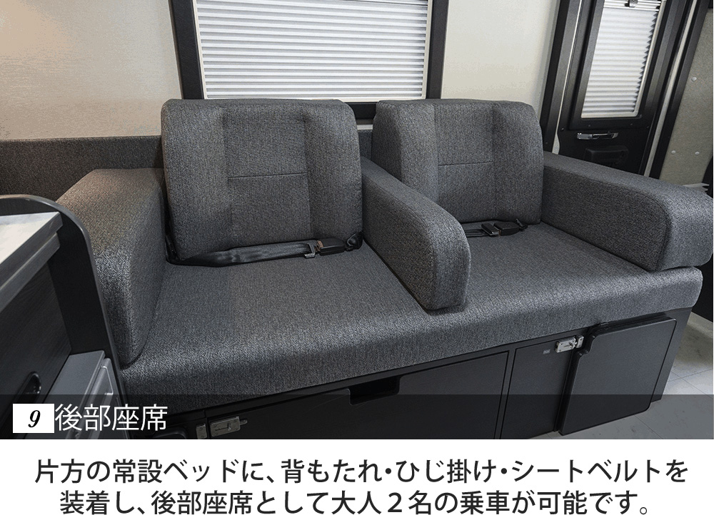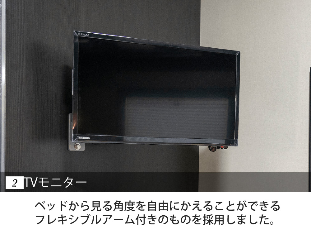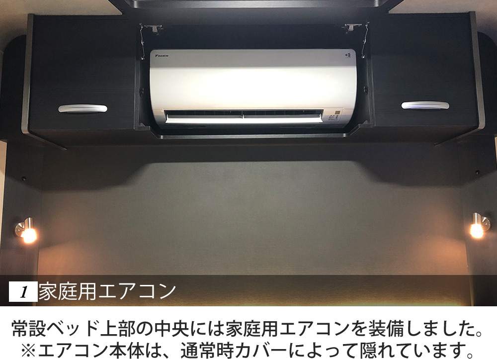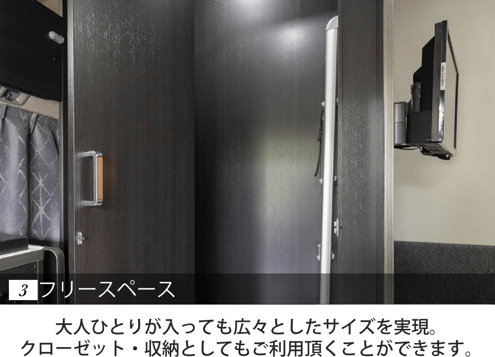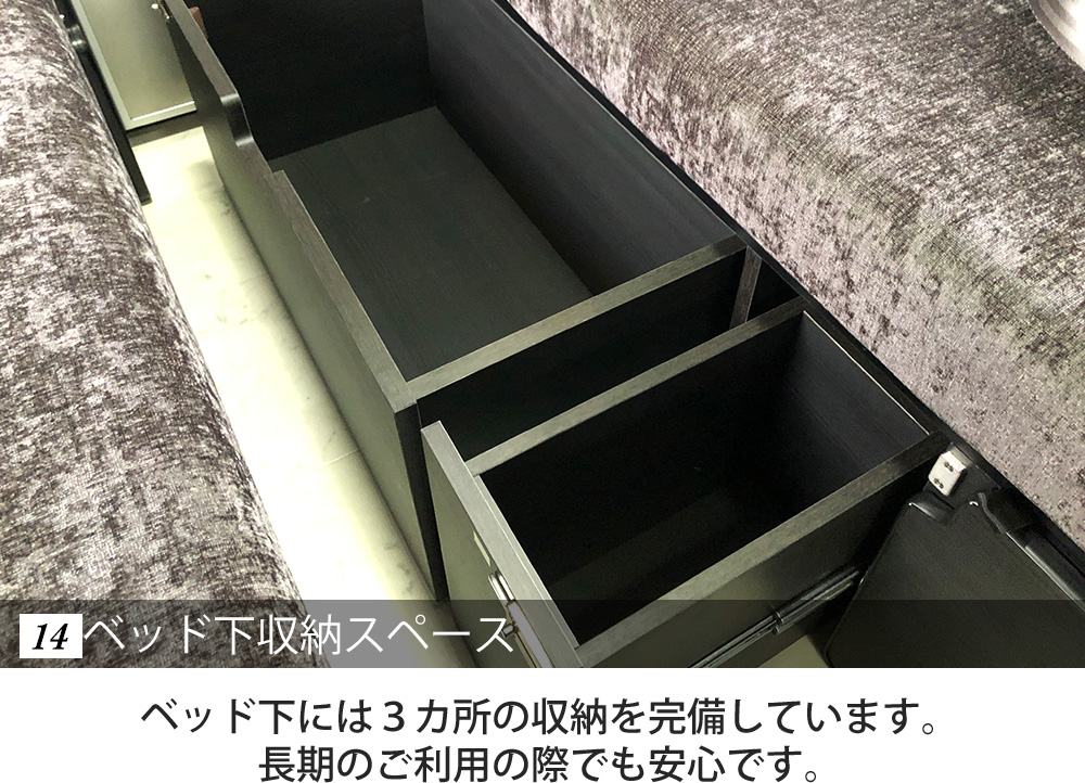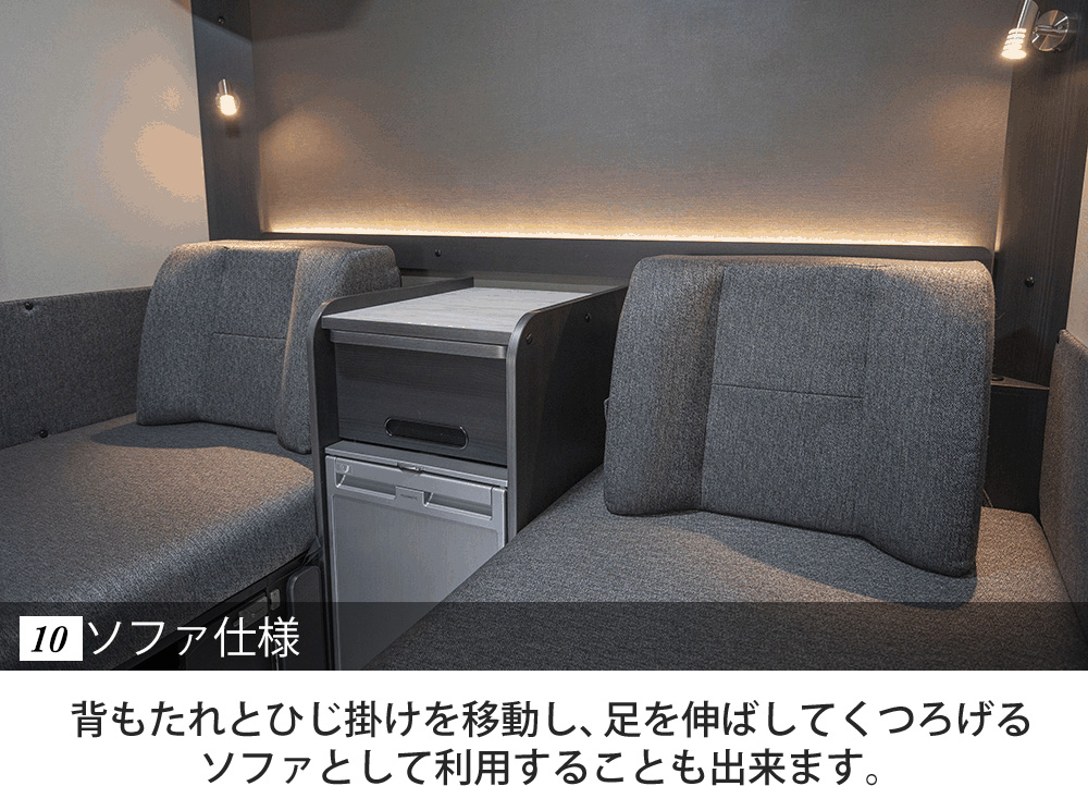 眠ることに特化し、両側に常設ベッドを大胆に配置することで、ゆったりとしたホテルの様な空間を実現しています。ベッドマットも安眠をサポートする為に選んだ、特殊立体構造のものを採用しています。